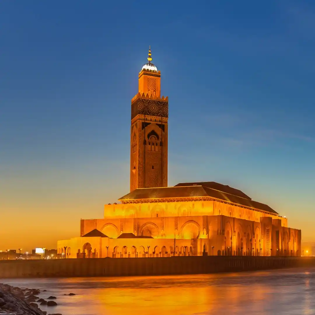 You leave Fes and drive to Rabat. You visit Hassan Tower, Mohammed V Mausoleum, and Oudaya Kasbah. You walk near the river and gardens. After lunch, you continue to Casablanca. You arrive in the evening and check into your hotel.