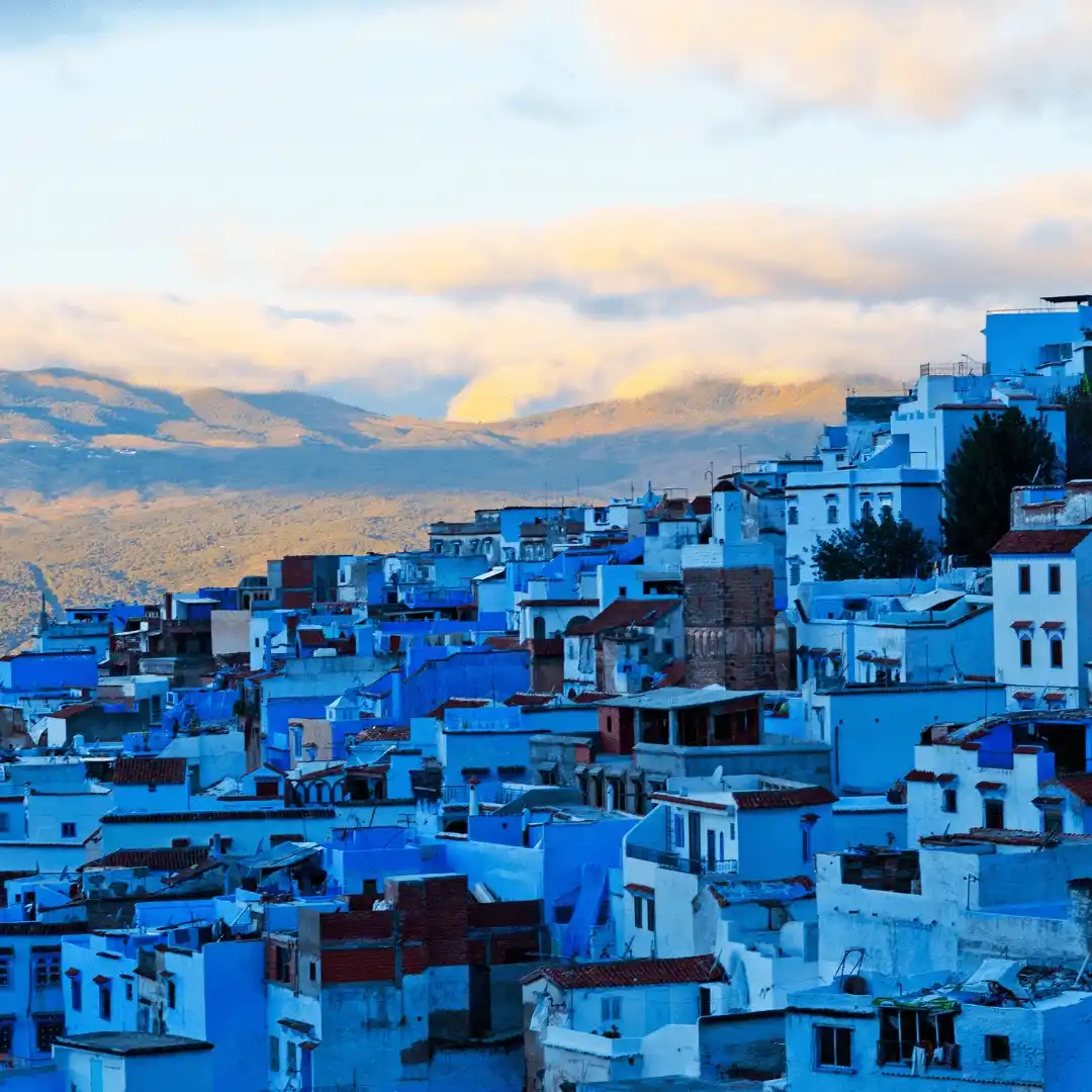 You start in Tangier with a short visit to the medina and coastal views. Then you drive into the Rif Mountains. You stop at Akchour for a walk near waterfalls and fresh air. In the afternoon, you reach Chefchaouen. You walk through blue streets, visit Outa El Hammam square, and explore the kasbah. At sunset, you head to the Spanish Mosque for a full المدينة view. Overnight in Chefchaouen.