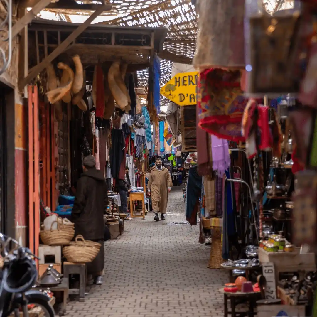 You explore Marrakech with a guide. You visit Koutoubia Mosque, Bahia Palace, and Saadian Tombs. You walk through the souks and الأسواق. You end the day in Jemaa El Fna with street food and local performances.