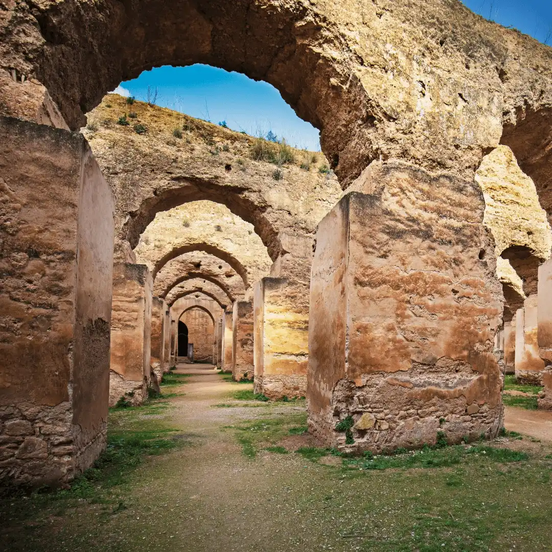 You leave early for Volubilis. You walk through Roman ruins, mosaics, and old streets spread over a large open site. Next stop is Meknes. You visit Bab Mansour, the royal stables, and the medina. After lunch, you continue to Fes. Before arrival, you stop at the Marinid tombs for a panoramic view. Overnight in a riad.